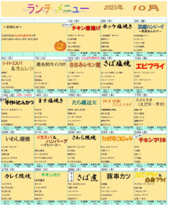2025年10月ランチメニュー <お知らせ> 10月8日(水)はけんぱち君弁当です。 10月31日(金)はハローウィンゼリーが入ります。