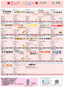 2026年2月ランチメニュー <お知らせ> 2月6日(金)は味ごはんです。 2月18日(水)はけんぱち君弁当です。