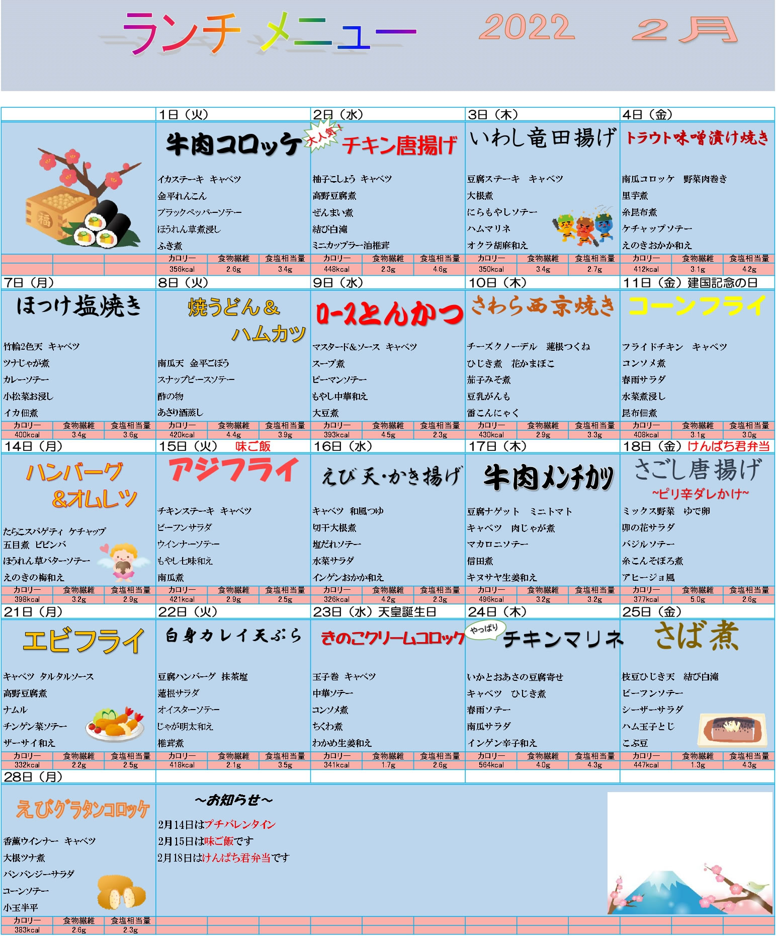 2月のメニュー一覧 2022年2月1日 最終更新日時 : 2022年2月10日 dearn 2022年2月ランチメニュー <お知らせ> 2月14日はプチバレンタイン 2月15日は味ご飯です。 2月18日はけんぱち君弁当です。