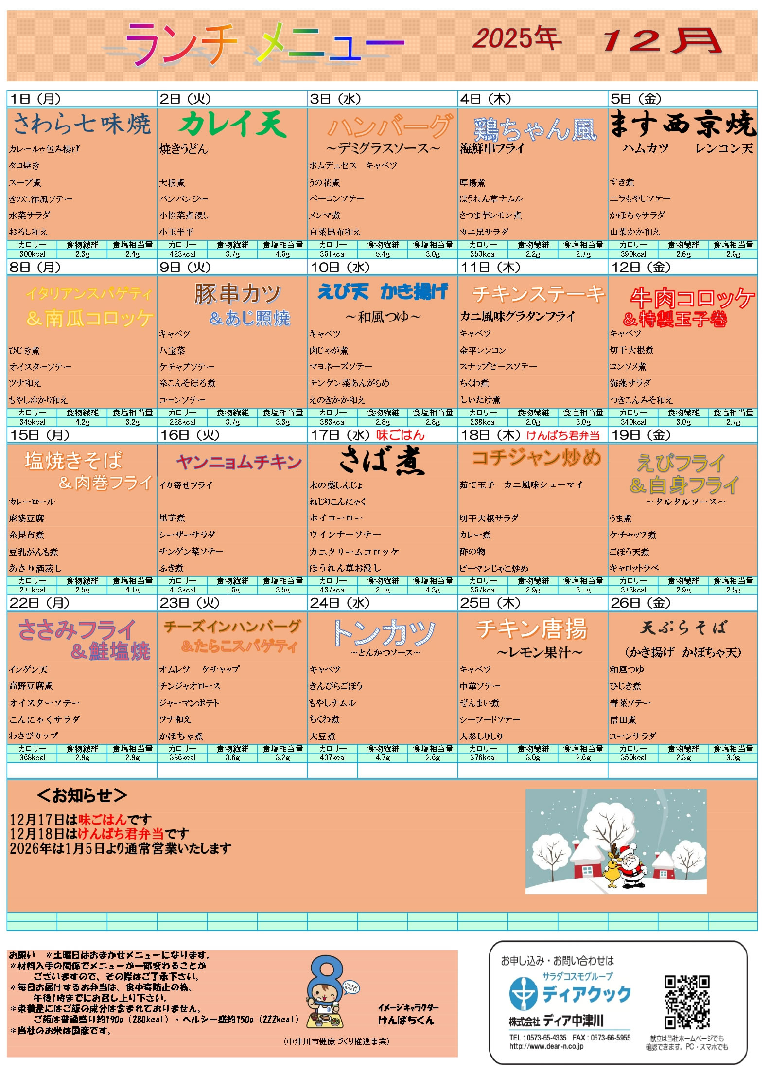 12月のメニュー一覧 2025年11月29日 最終更新日時 : 2025年11月29日 dearn 2025年12月ランチメニュー <お知らせ> 12月17日(水)は味ごはんです。 12月18日(木)はけんぱち君弁当です。